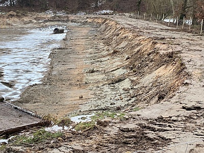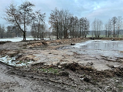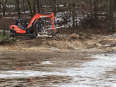 Mit schwerem Gerät konnten die Sanierungsarbeiten an der Teichanlage in Eichenzell vorangetrieben werden. Biber hatten einen Damm unterhöhlt, der bei dieser Gelegenheit instandgesetzt wurde. Ein spezieller Biberzaun soll künftig den Damm schützen. Gewässerwart Peter Richard und Baggerfahrer und ASV-Mitglied Marko Sachs waren die Verantwortlichen des Projekts. Unterstützt wurden sie von weiteren Vereinsmitgliedern.